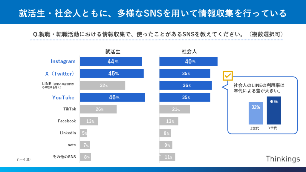 また、Thinkings株式会社の調査結果によると、就職活動・転職活動ともに、SNSは多様な場面で利用されていることがわかります。就活の情報収集では「Instagram」「X」「YouTube」を中心に、複数の媒体を利用している点が特徴です。