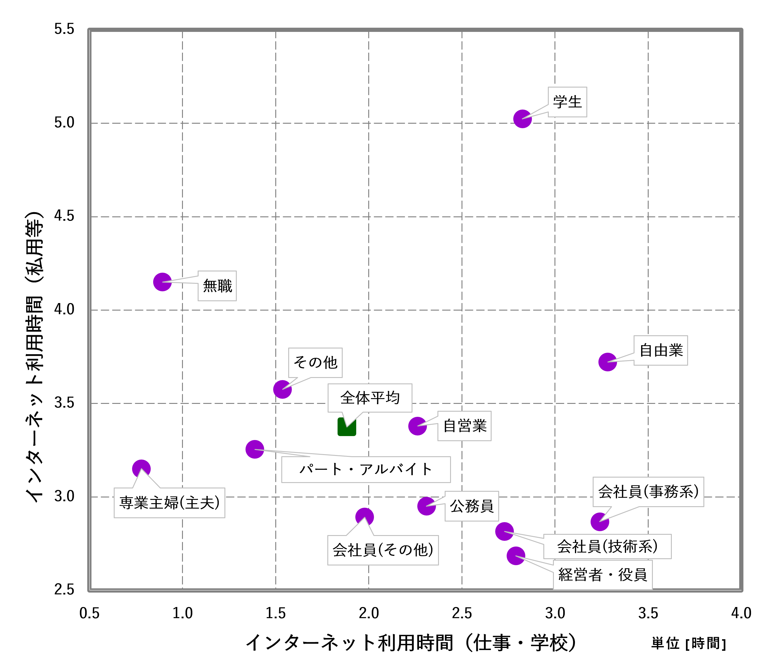 上記のデータは、インターネット利用時間を職業別に集計したものです。学生の利用時間は特に多く、仕事・学校目的で1日平均約3時間、私用で約5時間、合計で1日平均7.8時間となっています。