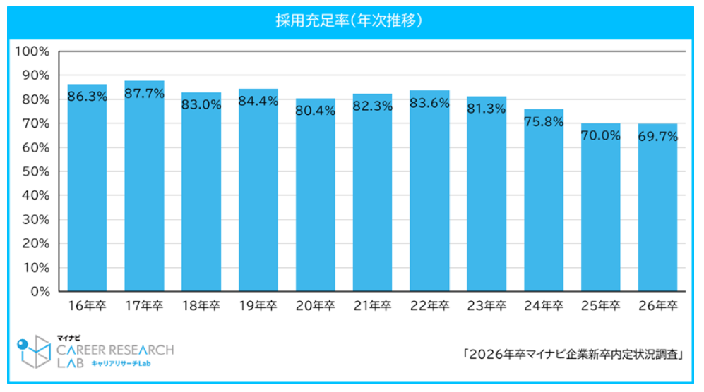 「2026年卒マイナビ企業新卒内定状況調査」によると、2026年卒の採用充足率は69.7%で、減少傾向は4年連続となりました。SNS採用が活発となり、求職者が複数企業を比較しやすくなったことで「自分に合う環境か」を重視する人が増加した点も影響しています。