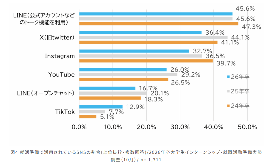 利用割合が特に高いLINE(公式アカウントなどのトーク機能)は、2024年卒から2026年卒まで、いずれの年度でも40%を超える結果です。一方、TikTokは2024年卒で5.1%、2025年卒で7.7%、2026年卒で12.9%と、年々利用割合が増加していることが分かります。