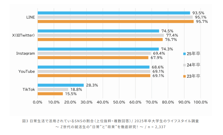 「2025年卒大学生のライフスタイル調査 ~ Z世代の就活生の“日常”と“将来”を徹底研究! ~」では、LINE、X、Instagram、YouTube、TikTokと、5つのプラットフォームにおける学生の利用割合が調査されました。