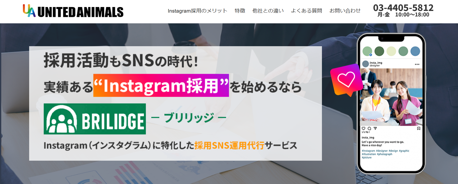 SNSを軸とした包括的なサポートを提供している株式会社ユナイテッドアニマルズでは、SNS採用支援サービス「BRILIDGE(ブリリッジ)」を展開しています。BRILIDGEではInstagramを活用し、企業のブランディングから求職者とのコミュニケーションまで、一気通貫でSNS採用を支援します。