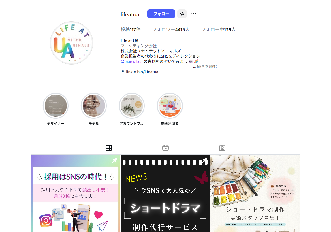 ユナイテッドアニマルズが運用するInstagramアカウント@lifeatua_は、自社の採用アカウントです。アカウントプランナー、フォトグラファー、Webデザイナー、ショートドラマ制作スタッフなどの求人を掲載しています。