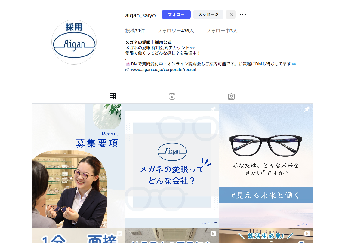 メガネ専門店「メガネの愛眼」の採用公式アカウント@aigan_saiyoは、支援事例のひとつです。SNSの強みを最大限に活用し、企業理念や募集要項の公開からオンライン説明会の案内まで行っています。