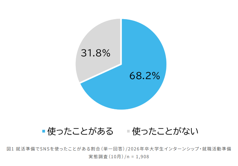 「2026年卒大学生インターンシップ・就職活動準備実態調査(10月)」では、就活準備でSNSを使ったことがある割合は68.2%でした。この結果から、多くの就活生が就職活動においてSNSを活用していることが分かります。